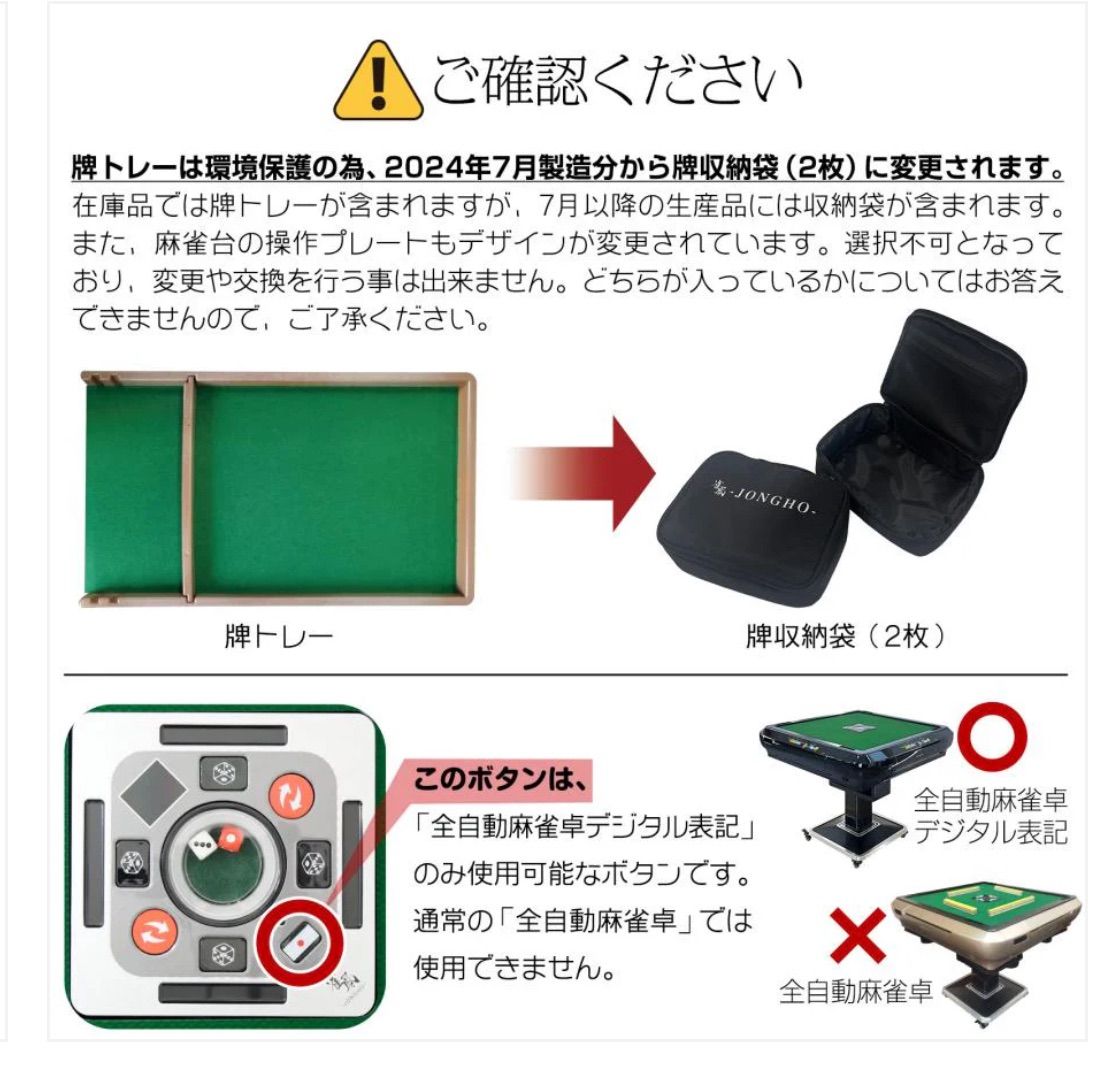 | 商品の特徴 | ☆【2024年最新モデル】JONGHO 全自動麻雀卓 折りたたみ式 静音。雀鳳 全自動麻雀卓 座卓 28mm 麻雀卓 全自動 折りたたみ 家庭用。☆【2024年最新モデル】JONGHO 全自動麻雀卓 折りたたみ式 静音。■送料込み!お支払い確認後、⚠️2〜3日(土・日・祝日を除く)以内に発送致します。Amazon | 【デジタル表記】ー雀鳳ージャンホウー 全自動麻雀卓。⚠️「大型サイズのため下記の地域は追加で送料が必要となります」⚠️北海道 1100 円沖縄本島・その他の離島 2200 円沖縄の離島 4400 円この地域の方は、先にコメントをお願い致します。麻雀牌セット 手打ちサイズ 竹背 48cm角雀卓付き。-------✅️他にも多数出品中です!#gagalarinnのマージャン台一覧D2144 78200-67200_3180【商品概要】こちらは新大阪の雀荘「大三元」様でも使用され、雑誌『家電批評』2023年8月号にも掲載された、信頼の全自動麻雀卓「JONGHO」最新2024年モデルです。★新品★ 全自動麻雀卓 折りたたみ 麻雀卓 デジタル点棒計算 ガラス製脚。静音設計と省スペース仕様で、自宅でも快適にプレイ可能。ミズノ丸一 麻雀牌 黒。1時間あたりわずか2.5円の省電力設計で、ランニングコストも抜群。アカギ 麻雀牌 DVD 特典 セット。さらに豊富な付属品がセットになっています!【特徴】・最新2024年モデル(雑誌掲載実績あり) ・省スペースなハーフレッグ構造 ・選べる牌サイズ:33mm(初心者向け)・リーチ棒置き付きで使いやすい中央操作パネル ・静音設計でマンションでも安心 ・1時間あたり約2.5円の低電力稼働 ・購入から1年2ヶ月で雀荘代より元が取れる経済性 【仕様】・本体サイズ:約90×90×48cm ・マットサイズ:約73×73cm ・牌サイズ:33mm・重量:約36kg前後 ・対応人数:3人打ち・4人打ち対応 【付属品】・麻雀牌2セット(赤ドラ・季節牌入り) ・点棒セット、リーチ棒 ・iPhone/Type-C充電ケーブル2本 ・専用カバー ・牌トレーまたは収納袋(いずれか) ・組立ドライバー、清掃ブラシ、クリーンボール ・東南マーク/焼き鳥マーク(いずれかの色) 【購入者メリット】✅ この商品は「省スペースで静かな全自動麻雀卓をお探しの方」に特におすすめ! ✅ 月々の雀荘代が不要!たった1年2ヶ月で元が取れる高コスパ ✅ 豊富な付属品ですぐにプレイ可能、初心者~上級者まで対応 ✅ 静音・省エネ設計でマンションや夜間の使用も安心 ✅ 組立サポート・日本語マニュアル・日本人スタッフ対応で購入後も安心 | ||